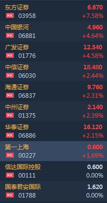 智通财经APP获悉,券商股随A股再度走高,东方证券(03958)A股涨停,H股涨超7%。截至10时35分,东方证券涨7.58%,中国银河(06881)及广发证券(01776)涨幅超4%,中信证券(06030)、海通证券(06837)及中州证券(01375)涨超2%。