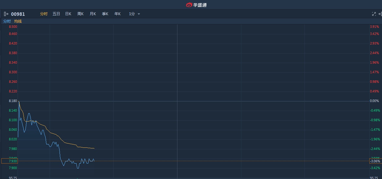 智通财经APP获悉,中芯国际(00981)遭富瑞下调目标价至7.5元,评级“持有”。截至10时41分,跌3.06%,报价7.93港元,成交额1.159亿。