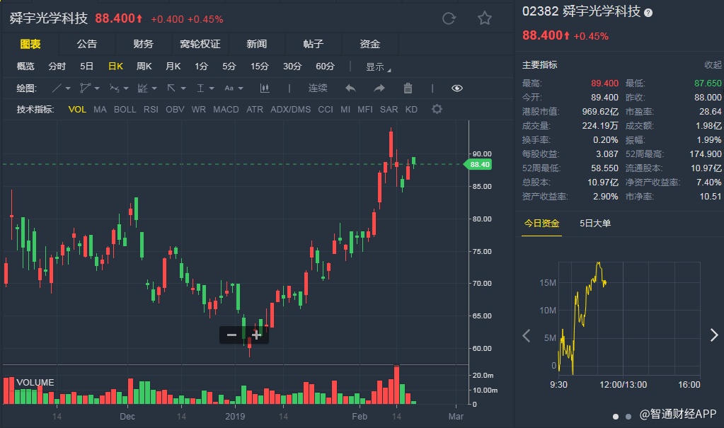 截至发稿,舜宇光学科技(02382)微涨0.45%,报88.400港元。
