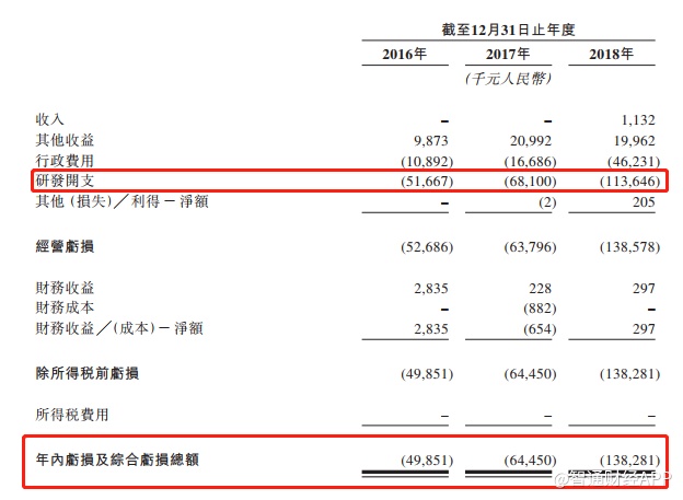 2016年及2017年,公司没有产品达到商业化阶段且产生收入为零,2018年通过向独立第三方提供研发服务,录得收入113.2万元(人民币.下同)。2016-2018年其他收入分别为987.3万元、2099.2万元、1996.2万元。支出方面最大的为研发费用,分别为5166.7万元、6810万元及1.14亿元。净亏损分别为4985.1万元、6445万元、及1.38亿元。公司预期未来数年的收入将主要来自该等临近商业化资产及公司产品线中的其他在研疫苗销售。