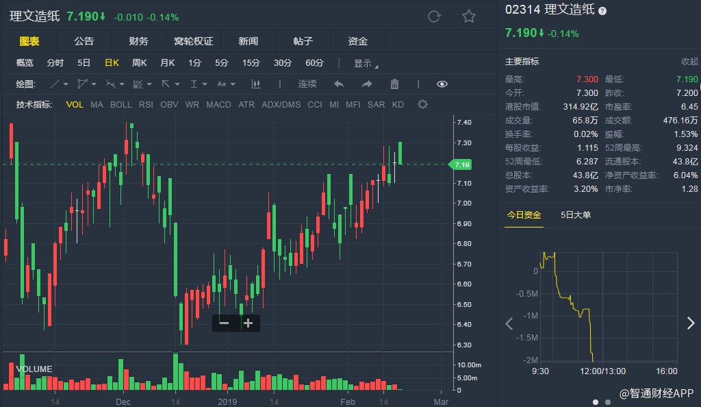 截至发稿,理文造纸(02314)微跌0.14%,报7.190港元。