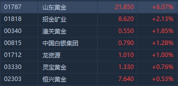 智通财经APP获悉,黄金股尾盘异动拉升,截至发稿,山东黄金(01787)涨6.07%,招金矿业(01818)涨2.13%,潼关黄金(00340)涨1.85%。