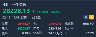 智通财经APP获悉,恒指早盘小幅高开,午后汇控公布业绩拖累大跌拖累恒指由升转跌,尾盘跌幅有所扩大。截至收盘,恒生指数跌118.88点或0.42%,报28228.13点,全日成交额达968.76亿。国企指数跌0.29%,报11116.92点,红筹指数跌0.73%,报4478.93点。