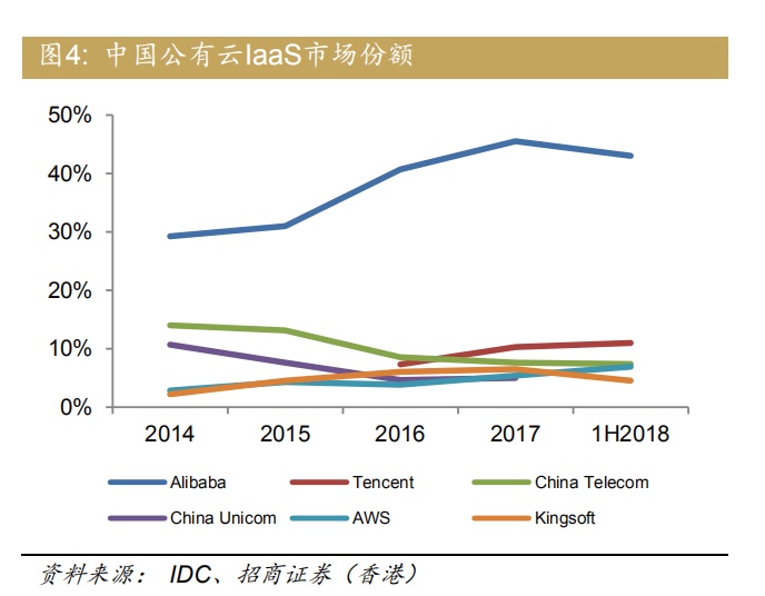 凭借技术创新、丰富的资金储备和大量客户资源的优势,互联网巨头阿里巴巴和腾讯正处于最佳位置,能够抓住公有云市场巨大的机遇。同时,金山软件也可以在一些垂直领域茁壮成长,但与前两者相比显然存在劣势。维持阿里巴巴(目标价205美元)和腾讯(目标414港元)的买入评级,也认为金山软件当前估值吸引(目标价24港元)。