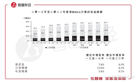 这与香港的土木工程承建行业现状不无关系。据Ipsos统计,2013年至2017年,香港RMAA行业收益总额由461亿港元增至622亿港元,年复合增长率7.8%。预计2018年至2022年将以0.5%的年复合增长率增至697亿港元。
