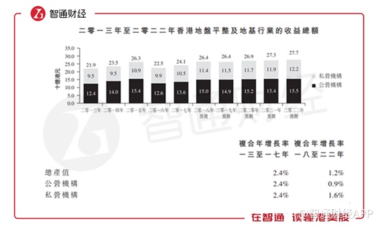 地盘平整及地基行业从2013年的219亿港元增至241亿港元,年复合增长率2.4%,预计2018年至2022年年复合增长率1.2%,由264亿港元增至277亿港元。
