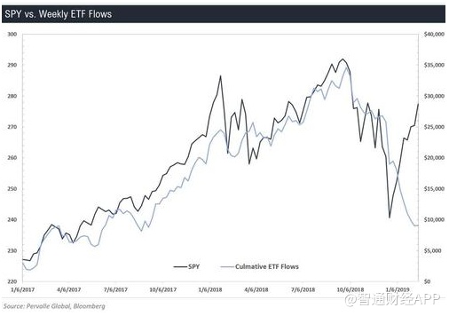 智通财经APP获悉,在美股12月暴跌之后,标普500指数连续8周上涨,上演了美股史上最强劲的反弹之一。但怪异的是,实际上在这场由轧空和回购驱动的反弹中,机构投资者和散户投资者并未进场买入股票。同时,尽管标普500指数出现飙升,但ETF几乎在持续抛售股票。