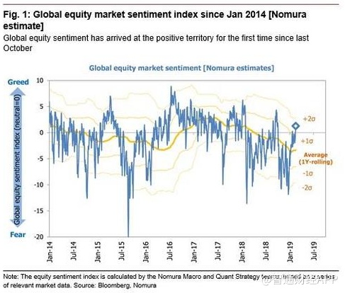 中美贸易谈判取得进展以及中国央行1月份大规模注入流动性,提振了华尔街信心,上周五美股出现投降式买盘,道指飙升444点,刷新这波反弹高点。与此同时,野村对美股和全球股市情绪的态度已经自去年10月以来首次转向正面。野村表示,一些投资者不只是在布局短线投资,也是在布局中长线投资,他们可能意识到不持有美股是一种损失,因此似乎出现了一种“恐慌性买盘”,且这种情绪日益升温,虽然他们的行动滞后于市场。