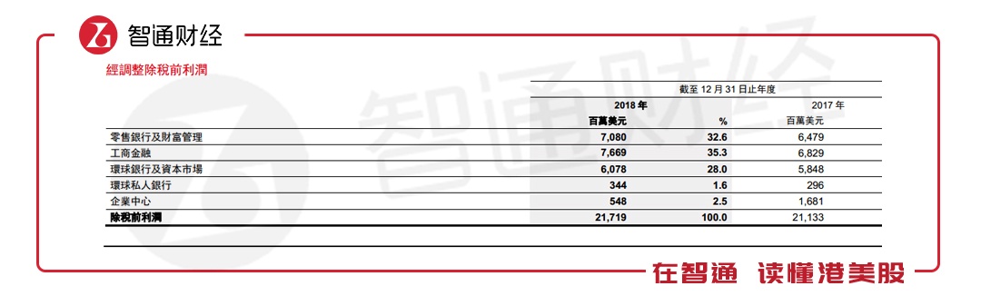 列账基准除税前利润为199亿美元,较2017年增加16%。经调整除税前利润为217亿美元,同比增长3%。