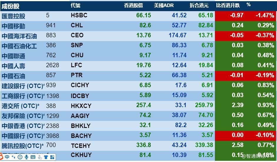 智通财经APP获悉,周二美股微涨,港股ADR指数也出现跟涨行情,按比例计算,收报28291点升63.04点或0.22%。大型蓝筹涨跌不一,汇丰控股收报65.18元,较港股收跌1.47%;腾讯控股收报339.38元,较港股收涨0.77%。