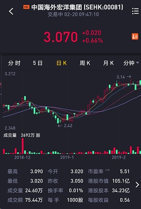 截至发稿,中海宏洋(00081)涨0.66%,报3.070港元。