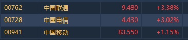 智通财经APP获悉,三大电信运营商早盘齐涨,截至发稿,中国联通(00762)涨3.38%,中国电信(00728)涨3.02%,中国移动(00941)涨1.15%。