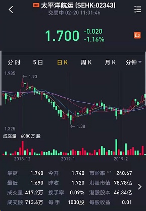 截至发稿,太平洋航运(02343)跌1.16%,报1.70港元。