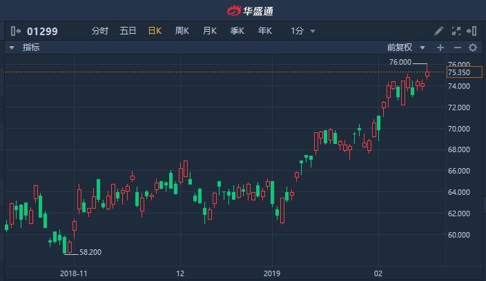 智通财经APP获悉,友邦保险(01299)早盘高开高走,盘中高见76元,创下上市新高,截至11时45分,涨1.42%,报75.25港元,成交额达7.584亿港元。