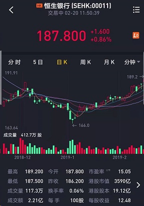 截至发稿,恒生银行(00011)涨0.86%,报价187.80港元。