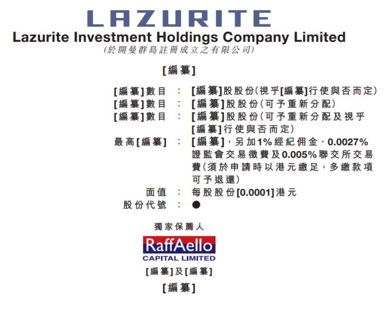 智通财经APP获悉,据港交所披露,2月19日,Lazurite Investment Holdings Company Limited向港交所创业板递交上市申请,RaffAello Capital Limited为其独家保荐人。