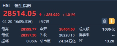 智通财经APP获悉,恒指早盘冲高回落,盘中低见28357点,午后再度走强。截至收盘,恒生指数涨285.92点或1.01%,报28514.05点,全日成交额达1086.45亿。国企指数涨1.01%,报11229.43点,红筹指数涨0.88%,报4518.29点。