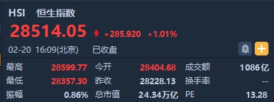 智通财经APP获悉,恒指早盘冲高回落,盘中低见28357点,午后再度走强。截至收盘,恒生指数涨285.92点或1.01%,报28514.05点,全日成交额达1086.45亿。国企指数涨1.01%,报11229.43点,红筹指数涨0.88%,报4518.29点。