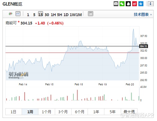 业绩公布后,嘉能可回吐今日涨幅,截至发稿时间,嘉能可在伦敦市场上报304.15便士。