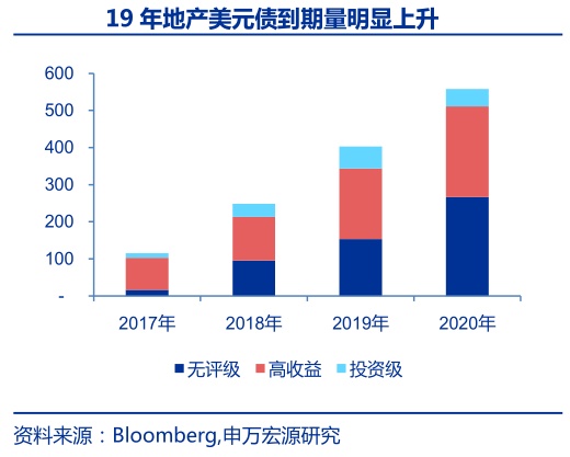 其次,受近两年美元债扩容放量影响,2019-2021 年大量无评级、高收益中资美元债到期,一级市场再融资需求较大。因此2019 年为房企美元债迎来第一个明显的到期高峰。