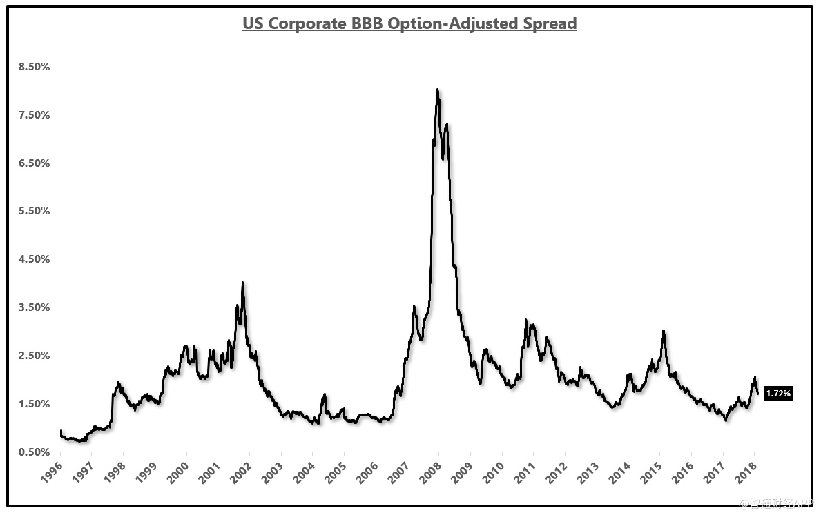 下图显示出美国BBB评级公司债券从1996年以来的信贷利差,在全球经济危机时,信贷利差达到顶峰后回落。在2018年底时的信贷利差为1.72%。