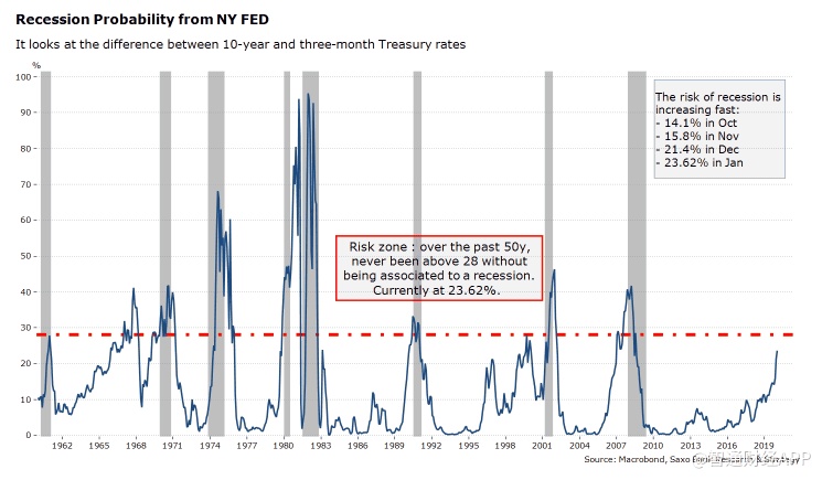 最近,美国衰退概率模型层出不穷。盛宝银行使用纽约联邦储备银行的衰退概率追踪器判断经济衰退的可能性,该模型跟踪的是10年期和3个月期美国国债利差。从该模型最新数据来看,2019年1月该利差指数已达到23.62%。