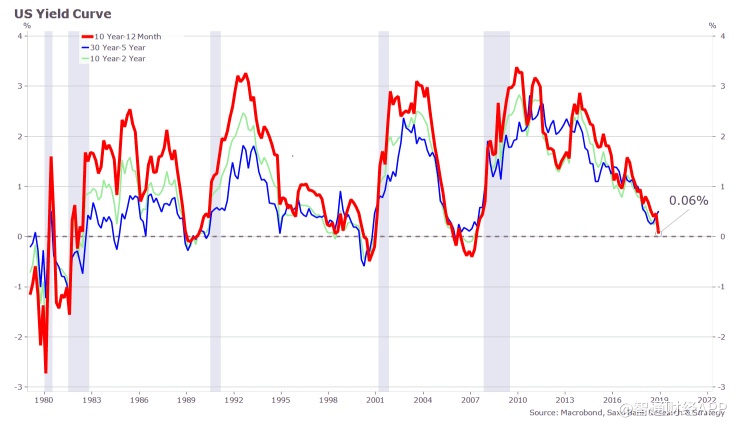 从1年期和10年期美债利差来看,收益率曲线还没有出现倒挂。最近,该指数已达+6个基点,但明显呈下降趋势。换言之,这意味着经济衰退风险日益增高,但基于前几十年的情况,衰退只会在几个季度后才发生。历史上,收益率曲线倒挂与衰退之间的滞后期平均为22个月。如果历史重演——尚不确定——那2020年发生衰退的可能性很高。