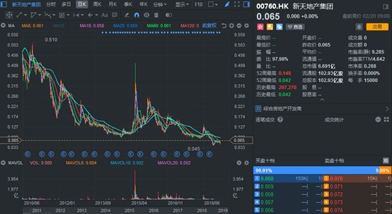 在全国范围,尽管新天地产可能并不算知名,但在广州本地却颇具人气,特别是其旗舰项目新天半山墅,号称是“城央海拔最高的豪宅”。不过与本土人气相比,该公司二级市场表现可谓“一潭死水”,多个交易日盘面呈现“三无”——无交易额、无交易量、无报价,市值仅仅为6.61亿港元。