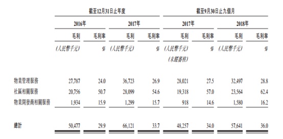 从毛利率上看,2016年、2017年及2018年1-9月和泓服务物业管理服务的毛利率分别为24.0%、26.9%及28.8%;社区相关服务毛利率分别为50.7%、54.6%及62.4%;及物业开发商相关服务毛利率分别为15.9%、15.7%及16.2%,整体毛利率分别为29.9%、33.7%、36%。