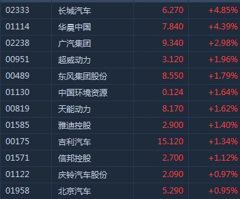 截至10时26分,长城汽车(02333)涨4.85%,华晨中国(01114)涨4.39%,广汽集团(02238)涨2.98%,东风(00489)涨1.79%,吉利(00175)涨1.34%,北汽(01958)涨0.95%。