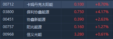 智通财经APP获悉,光伏股早盘普涨,截至发稿,卡姆丹克太阳能(00712)涨8.7%,保利协鑫(03800)涨4.17%,协鑫新能源(00451)涨2.63%,阳光能源(00757)涨1.27%,信义光能(00968)涨0.61%。