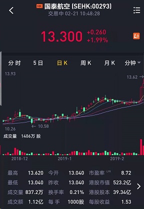 截至发稿,国泰航空(00293)涨1.99%,报13.30港元。