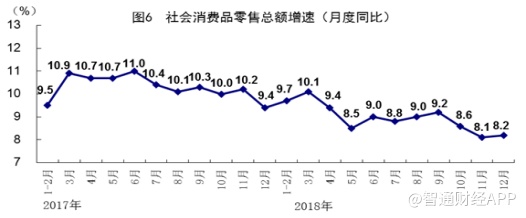 国家统计局近期公布的2018年社会消费品零售总额数据(“社消零”),2018年全年,中国“社消零”总额38.1万亿元,增速下滑至9.0%(扣除价格因素实际增长6.9%,以下除特殊说明外均为名义增长)。国家统计局数据显示,近两年来,中国“社消零”增长速度呈现出下降趋势,2018年四季度“社消零”增速连续三个月低于9%。