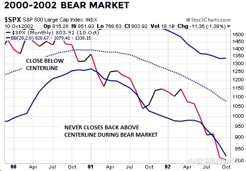 2000-02年熊市也是如此,标普500指数在2000年第四季度跌破中轨以后,就无法重新回到布林通道中轨之上。如下图所示,第四季度之后情况进一步恶化。2001年2月标普500指数收于下轨以下: