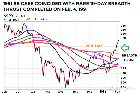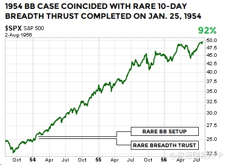 上述布林通道技术形态属较为罕见的类型。值得注意的是,1954年和1991年时的另一技术指标,广量冲力指标,基本上与2019年1月21日出现的广量冲力指标形态类似。因此,在1954年、1991年和2019年,标普500指数走出了布林通道及广量冲力指标都相似的技术形态。