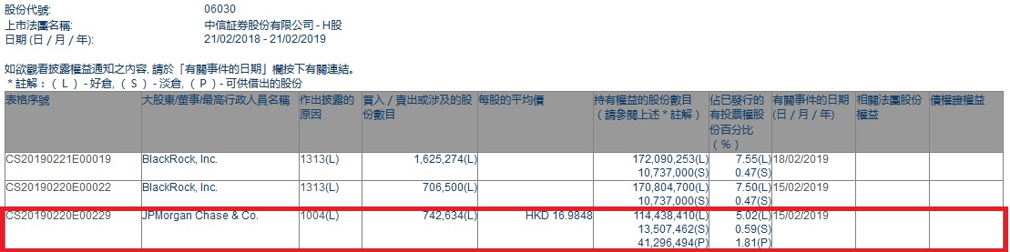 智通财经APP获悉,根据联交所资料显示,摩根大通于2月15日增持中信证券(06030)74万股,每股作价16.98港元,总值1256.52万港元,最新持股数增至1.14亿股,最新持股比例增至5.02%。