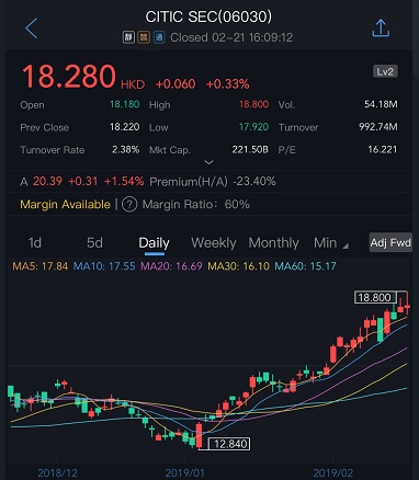 截至今日收盘,中信证券升0.33%,报18.28港元。