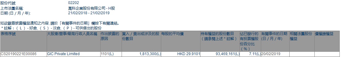 智通财经APP获悉,根据联交所资料显示,GIC Private Ltd于2月20日增持万科企业(02202)181万股,每股作价29.91港元,总值5413.71万港元,最新持股数增至9,346万股,最新持股比例增至7.11%。