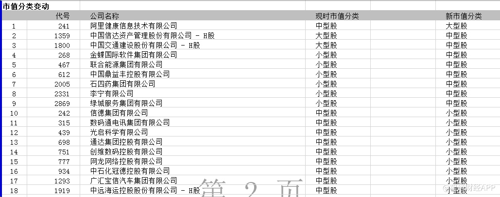 另外市值分类方面也有所变动,如阿里健康(00241)被调整为大型股。