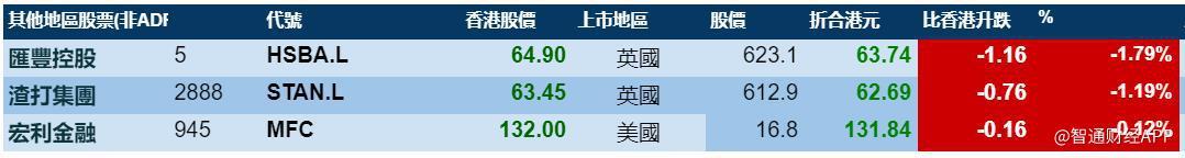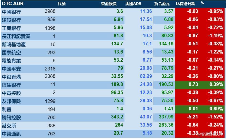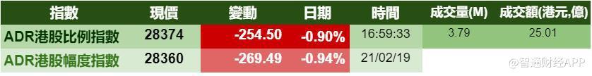 智通财经APP获悉,周四美股出现回调,港股ADR指数也随着下跌,按比例计算,收报28374点跌254.50点或0.90%。大型蓝筹也无一幸免,集体下跌,汇丰控股收报64.05元,较港股收跌1.31%;腾讯控股收报337.99元,较港股收跌1.52%。