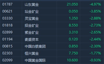 智通财经APP获悉,黄金股早盘疲弱,个股普跌,截至发稿,山东黄金(01787)跌4.97%,坛金矿业(00621)跌3.85%,灵宝黄金(03330)跌2.88%,招金矿业(01818)跌2.73%,紫金矿业(02899)跌2.65%。