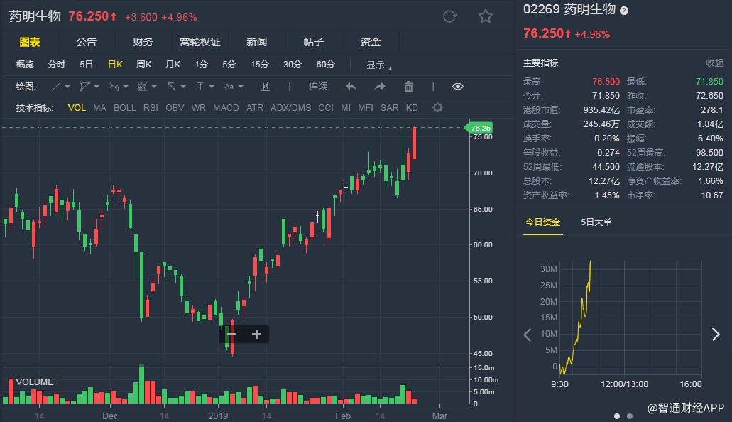 截至发稿,药明生物(02269)升4.96%,报76.250港元。