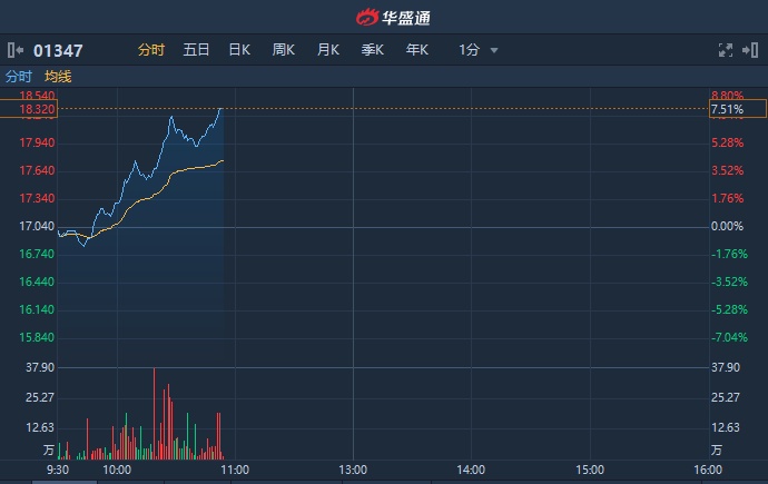 智通财经APP获悉,华虹半导体(01347)早盘现冲高态势,截至10时53分,涨7.51%,报18.32港元,成交额达1.085亿港元。