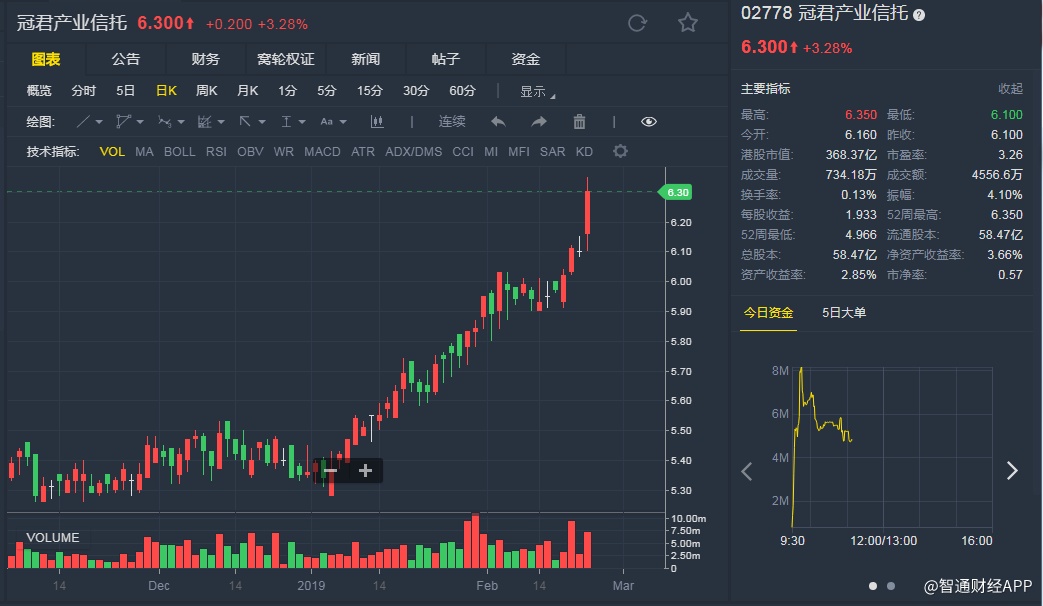 截至发稿,冠君产业(02778)升3.28%,报6.300港元。