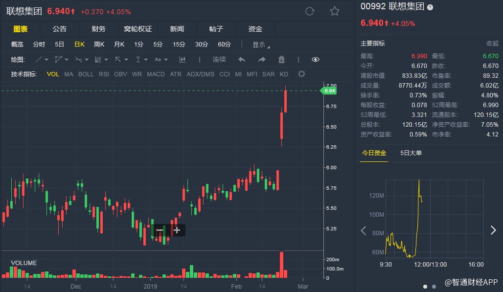 截至发稿,联想集团(00992)升4.05%,报6.940港元。