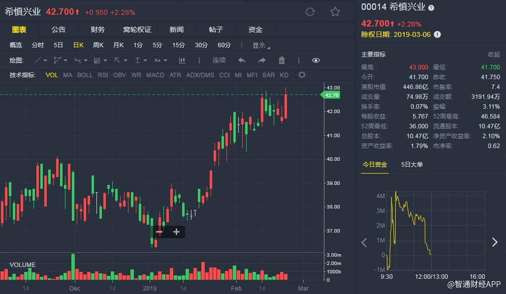 截至发稿,希慎兴业(00014)升2.28%,报42.700港元。