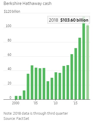 根据华尔街日报的消息,伯克希尔拥有的现金与日俱增,2018年预计达到1036亿美元。