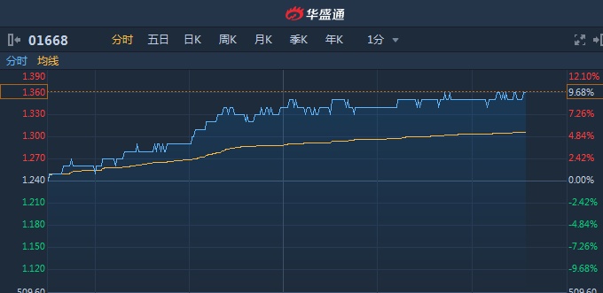 智通财经APP获悉,华南城(01668)今日受市场资金追捧,股价大涨。盘中涨至1.36港元,创年内新高,截至15时32分,涨9.68%,报价1.36港元,成交额1.673亿。