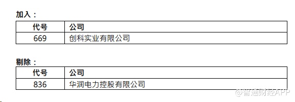 恒生指数成分股将增加创科实业(00669),同时剔除华润电力(00836),成份股数目固定为50只。