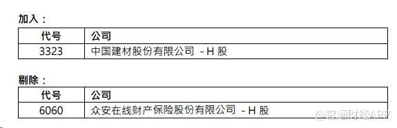恒生中国企业指数将增加中国建材(03323),同时剔除众安在线(06060),成份股数目固定为50只。